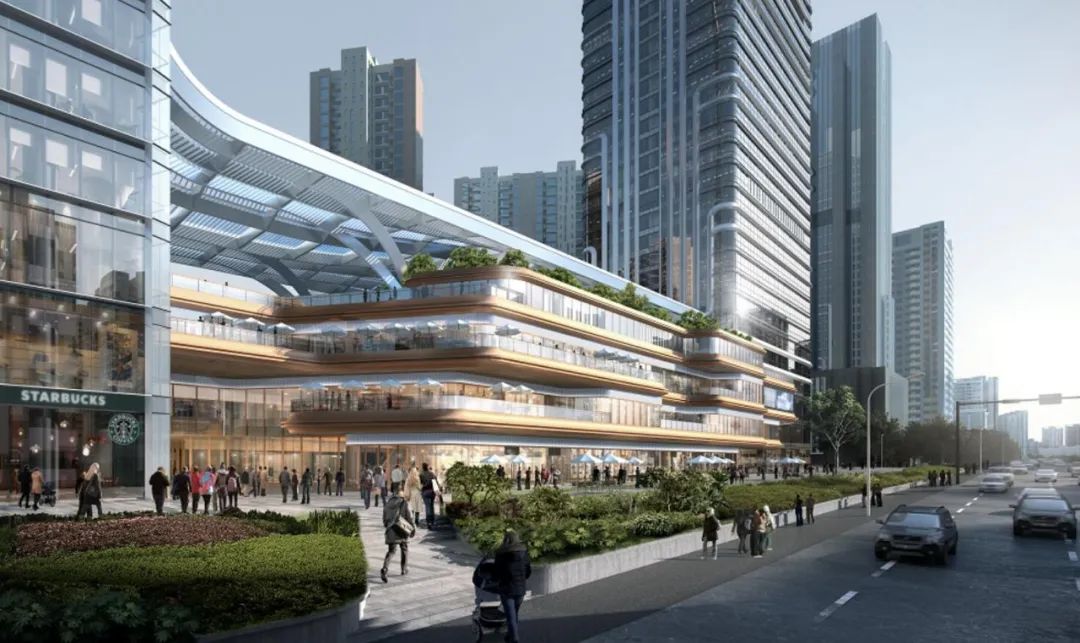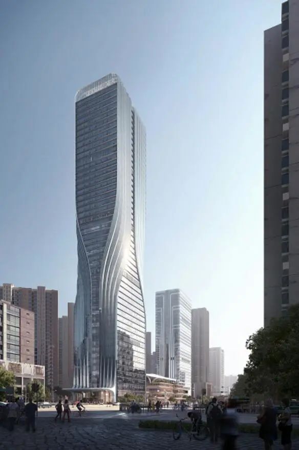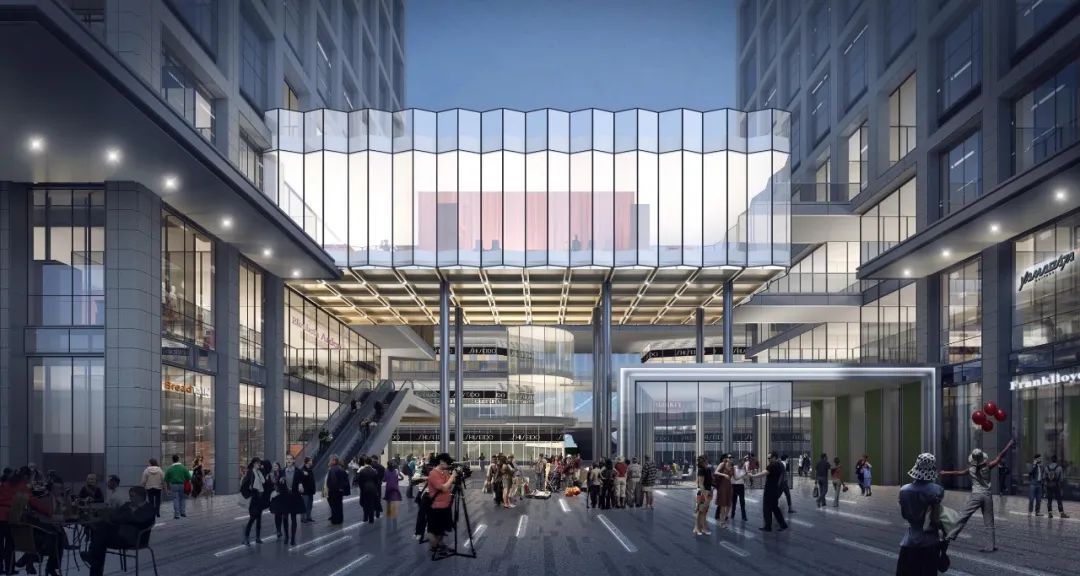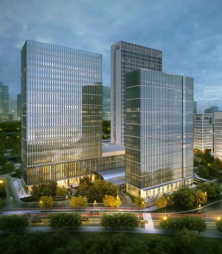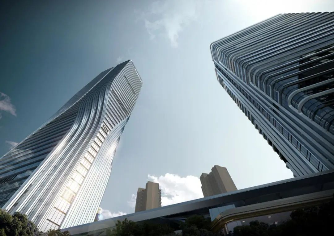 建筑群将5A甲级写字楼(北塔)作为设计中心,以其外立面双侧纽带状纵向上升的线条作为主要形态线索,以集中商业上方连接南塔外立面的大型构架作为装饰线条,整体形态神似两条伏立大地的蛟龙盘旋而升,打造稳重、腾飞的精神地标。