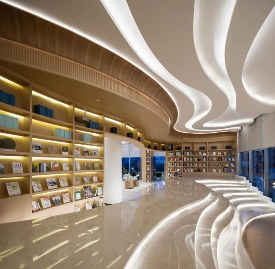 其中漂浮着空中“云层”穿插于“山”间,连绵不绝;建筑通过体量的扭转,增加了多个展示面,立面丰富。