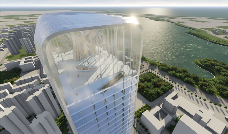 项目整体建筑群概念统一、主题鲜明、展示性突出:以“升龙”作为设计概念及造型灵感来源,自武汉发源地蟠龙城汲取 “伏卧大地,蟠龙而升”的 概念,寓意建筑根植大地,起势而升。