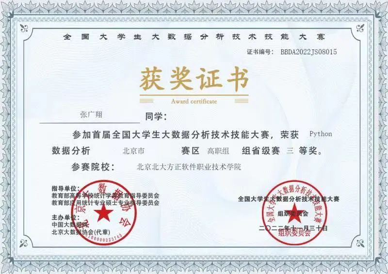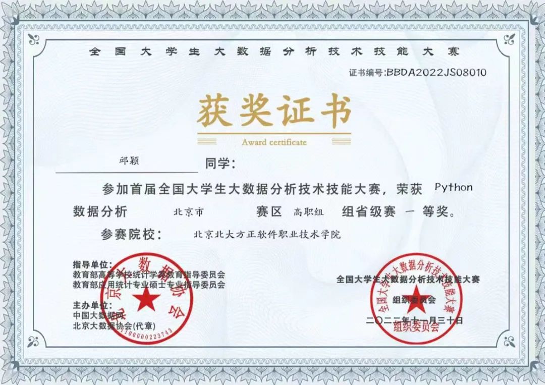 2022年11月,北大方正软件学院(以下简称软件学院)学生参加首届全国大学生大数据分析技术技能大赛喜获佳绩。在指导教师钟霖、朱松的带领下,来自21级大数据技术专业1班邱颖同学荣获一等奖,来自20级软件技术专业2班刘炳麟和张广翔同学分别荣获一等奖和三等奖。