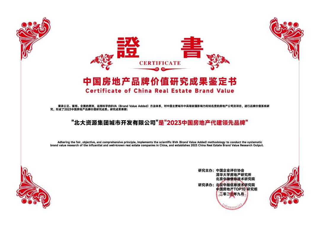 2023年9月14日,由中国企业评价协会、清华大学房地产研究所、北京中指信息技术研究院主办,北京中指信息技术研究院中国房地产TOP10研究组承办的“2023中国房地产品牌价值研究成果发布会暨第二十届中国房地产品牌发展论坛”在北京隆重召开。北大资源荣获“2023中国房地产代建领先品牌”荣誉。